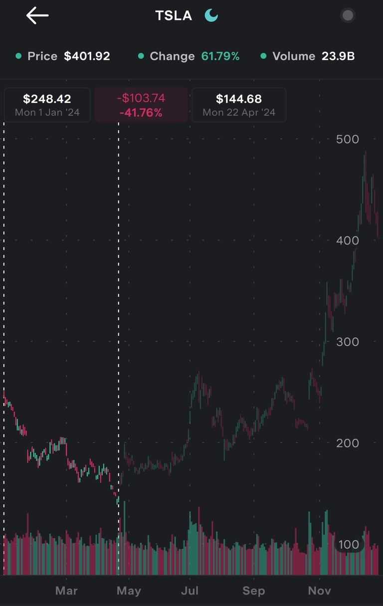 Tesla stock market price performance during its worse net revenue quarter apart from 2020. Net revenue reported was 55% down compared to previous period. Stock market price mirrored it hitting 41% down the exact day Tesla released.