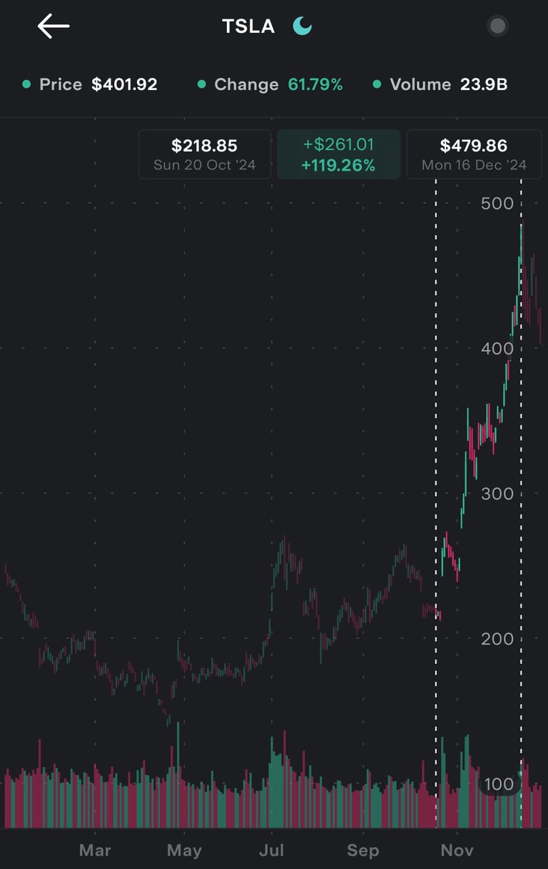 Tesla stock market price performance after Elon pledged 75 million USD to support Trumps campaign, what was the reaction? Stock market rallied to hit 119 % in less than two months what means that the sentiment as psicological as it is, is groundless and should only be used to cash out not to predict any entry worth trade.